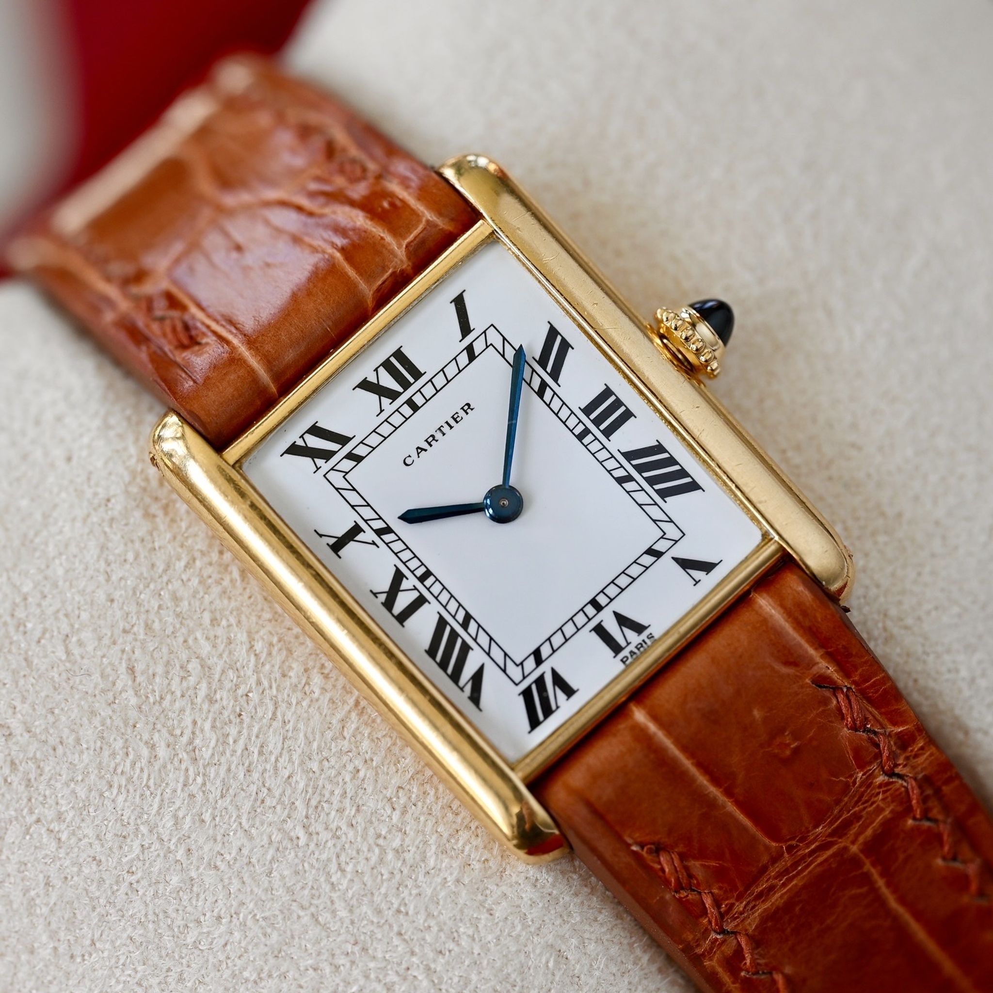 This watch has just returned from a full restoration by Cartier in Switzerland. No expense was spared and the restoration took over a year to complete and cost $2600! The attention to detail they took in bringing this watch back to its former glory was immense and I’m pleased to report they did an incredible job. Keeping it true to its period design details down to the Paris dial and even leaving the case unpolished as requested preserving deep hallmarks and engravings.