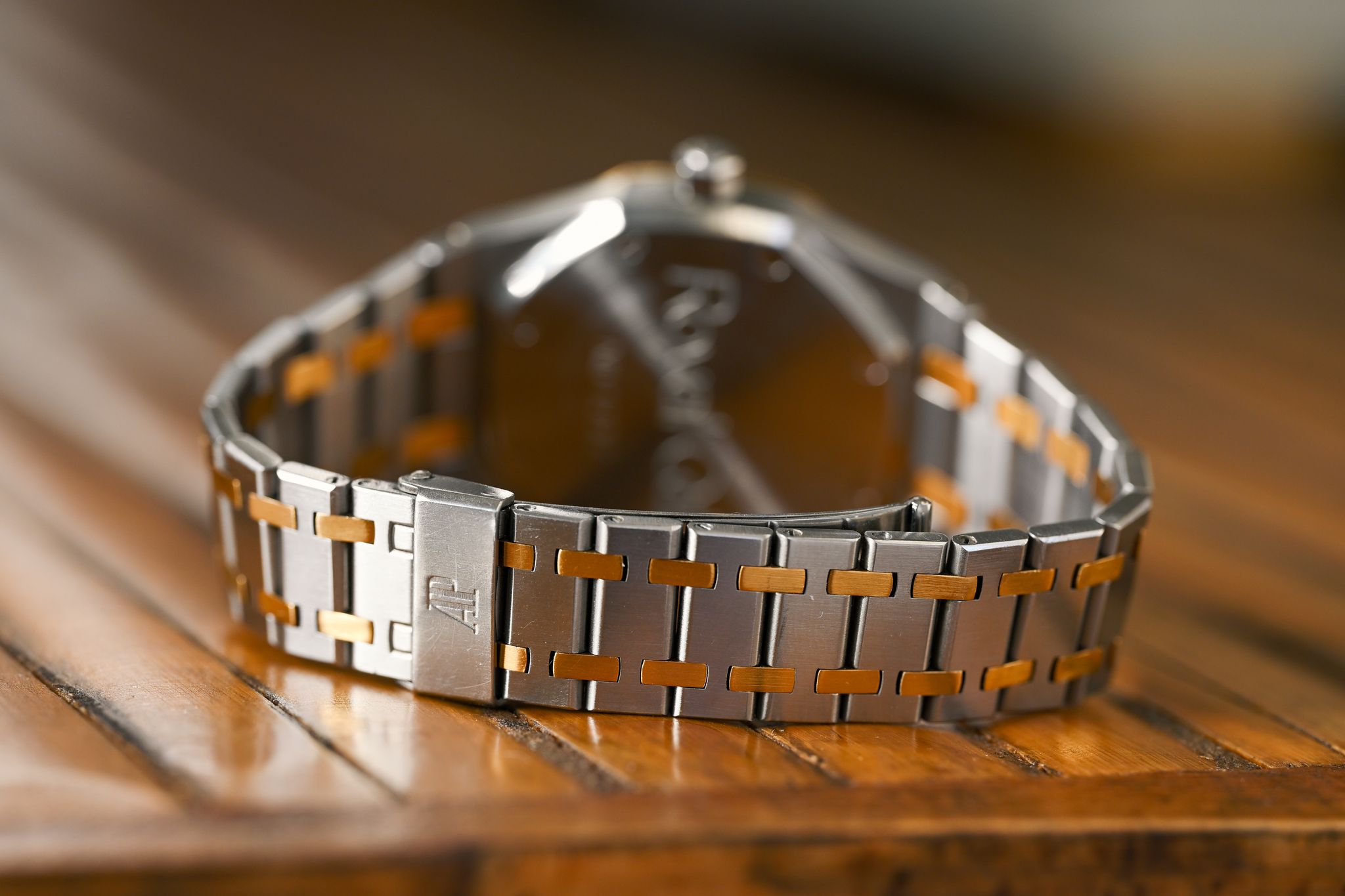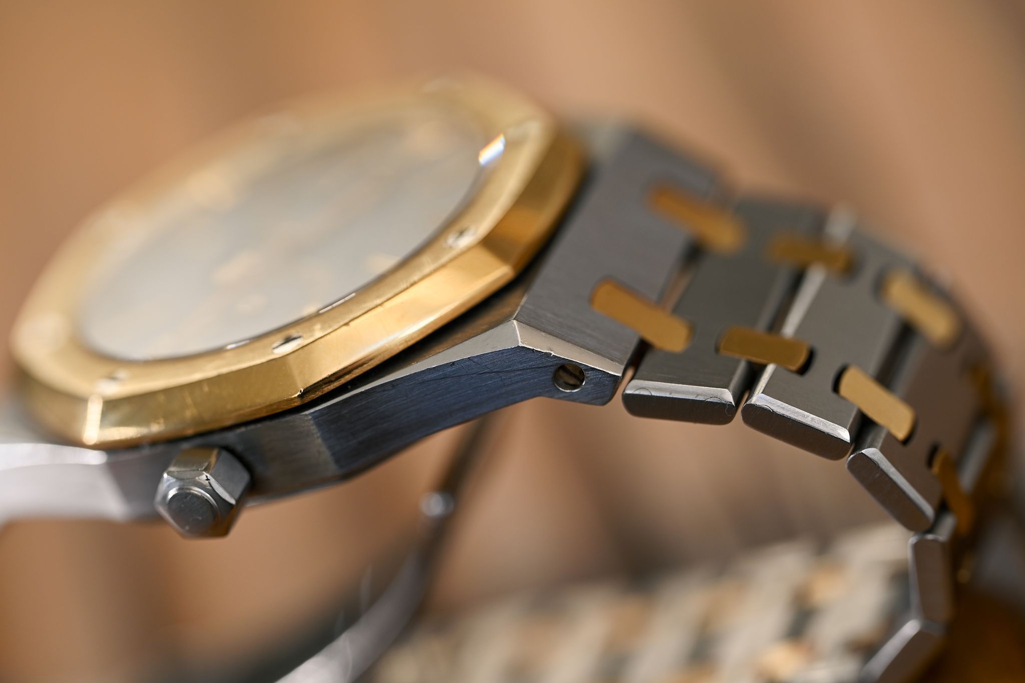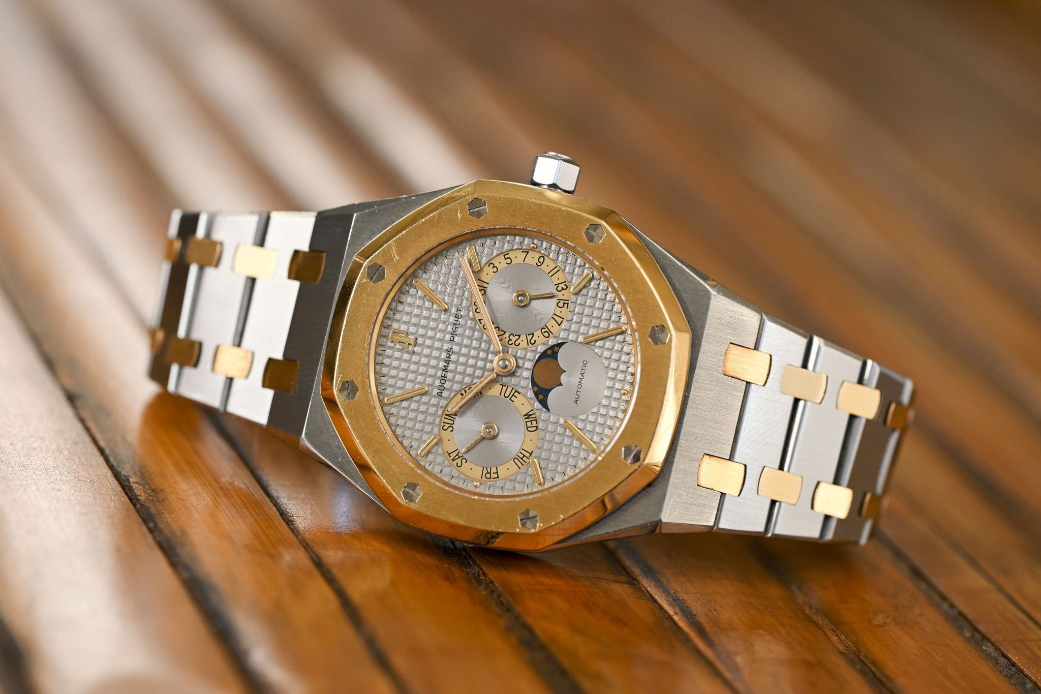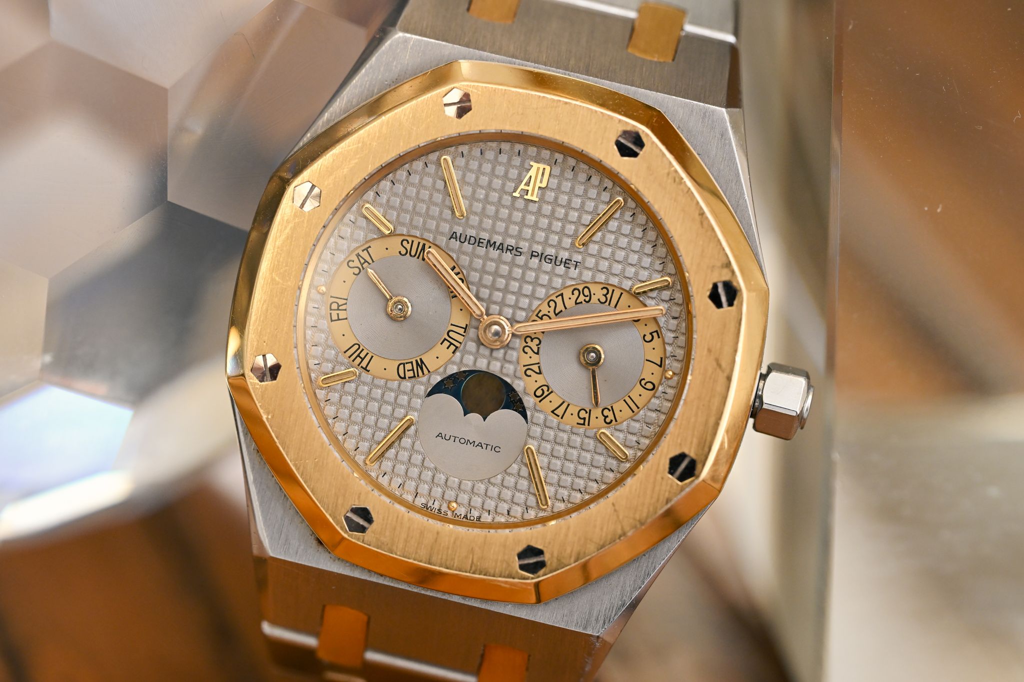 Launched in 1984 AP added day, date and moonphase complications to the iconic Gerald Genta design giving the watch a more balanced dial layout. They also opted for a more moderate case size of 36mm which many find to be ideal for the Royal Oak. This model was an instant hit and remained in the catalogue for 20 years! Despite this lengthy production only 6,534 units were produced; 1,764 of which being two tone steel and 18k yellow gold. Obviously changes were made over the years from dial fonts to bracelet claps. This example is one of the early iterations with vintage dial font and clasp. It remains in all original and unpolished condition with a stunning light grey Tapisserie dial. Featuring a Jaeger LeCoultre based automatic calibre 2124/2825.