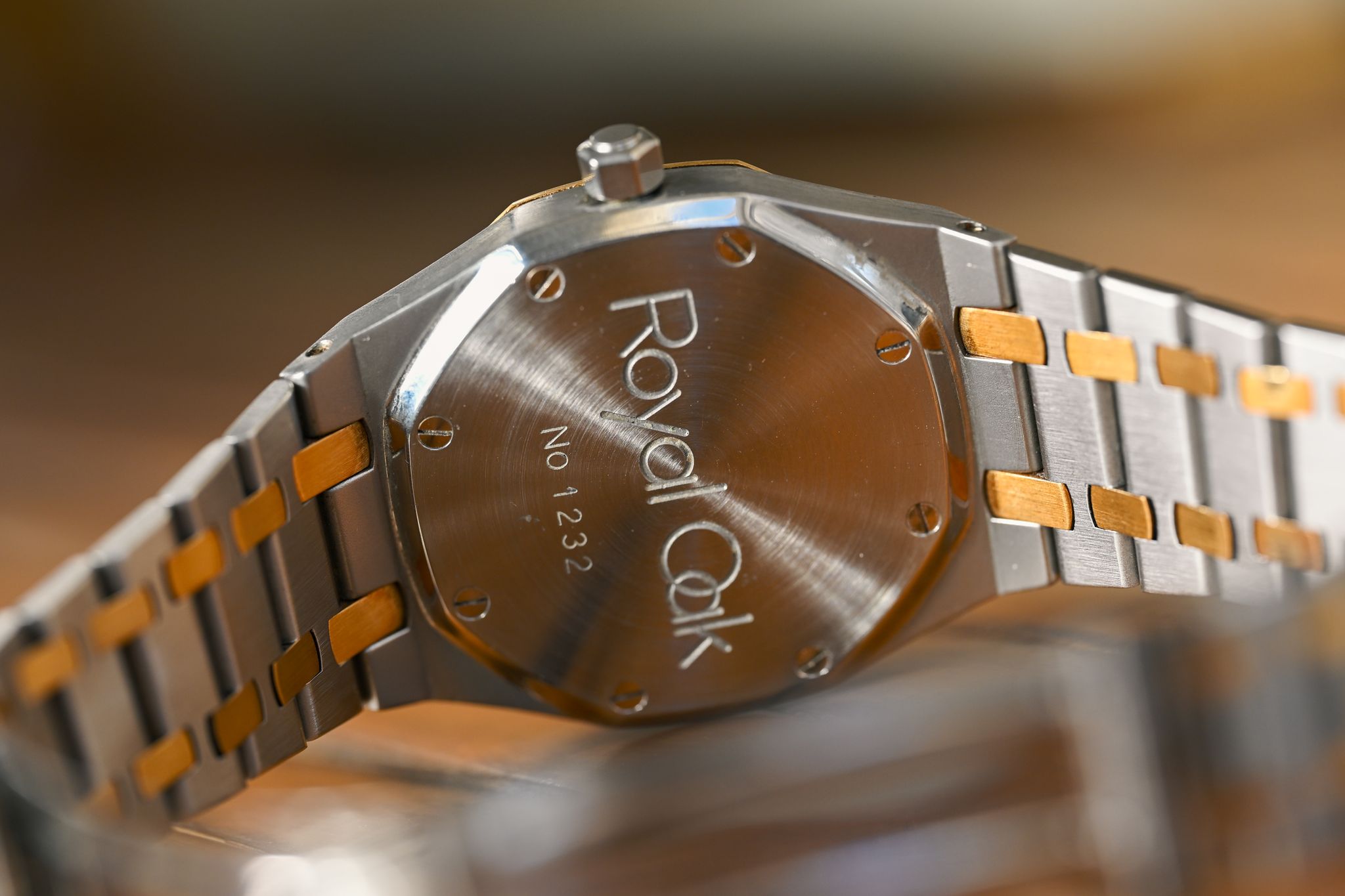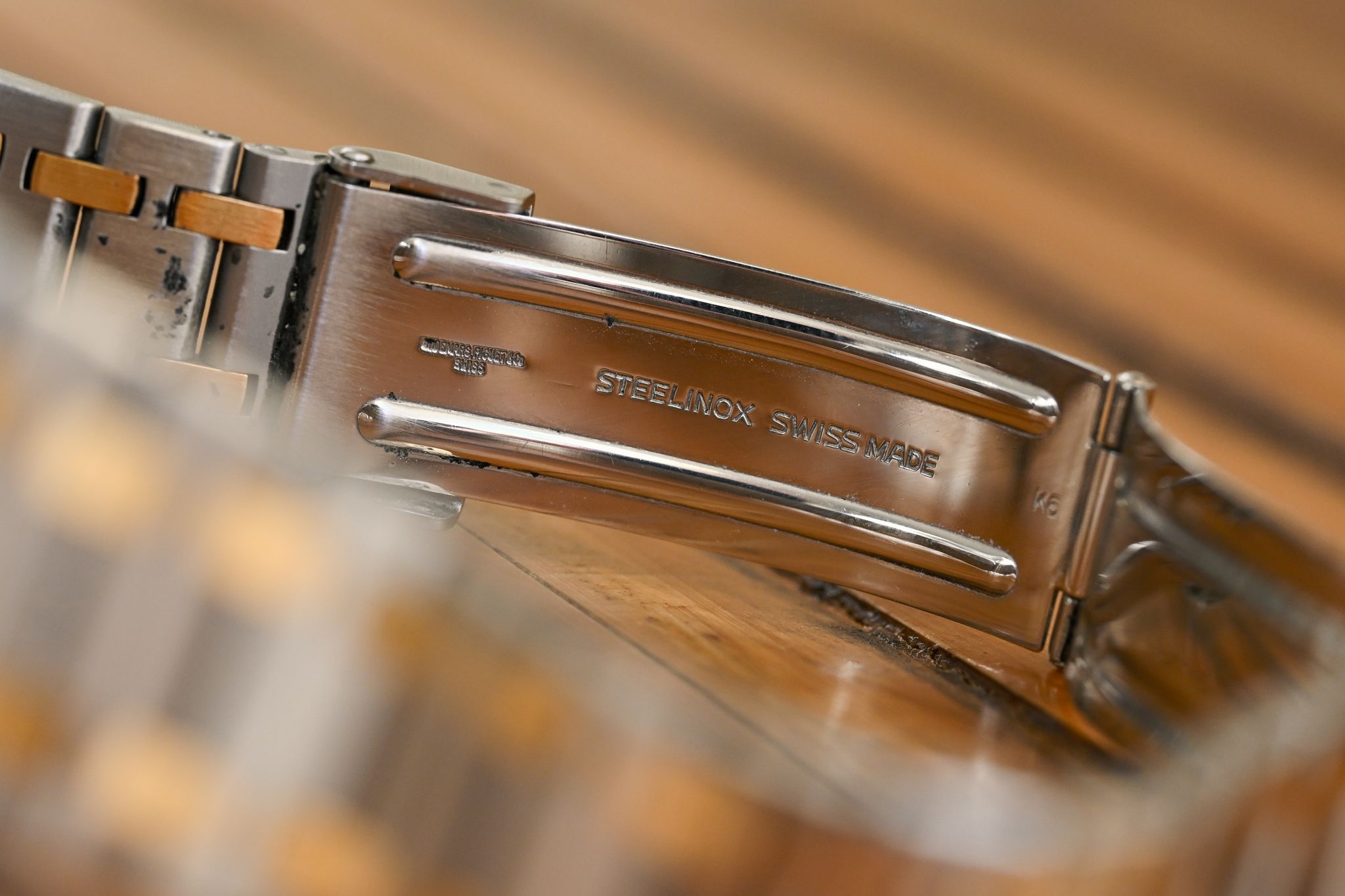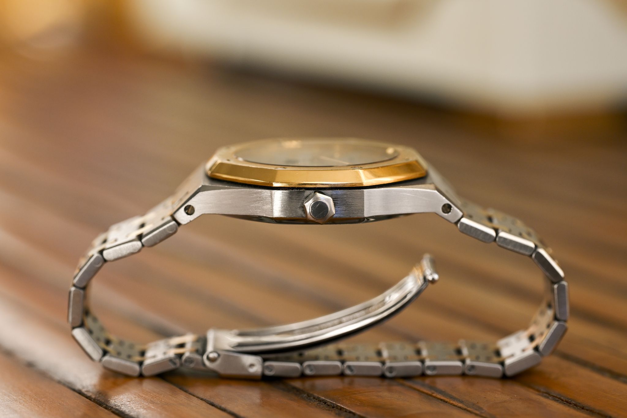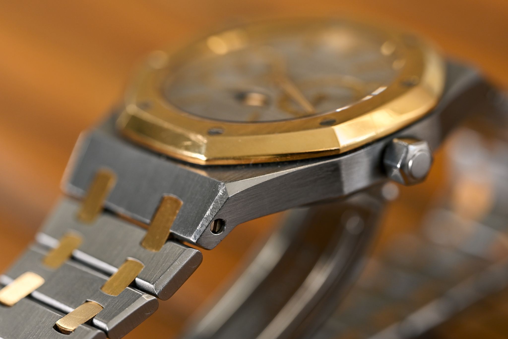 Launched in 1984 AP added day, date and moonphase complications to the iconic Gerald Genta design giving the watch a more balanced dial layout. They also opted for a more moderate case size of 36mm which many find to be ideal for the Royal Oak. This model was an instant hit and remained in the catalogue for 20 years! Despite this lengthy production only 6,534 units were produced; 1,764 of which being two tone steel and 18k yellow gold. Obviously changes were made over the years from dial fonts to bracelet claps. This example is one of the early iterations with vintage dial font and clasp. It remains in all original and unpolished condition with a stunning light grey Tapisserie dial. Featuring a Jaeger LeCoultre based automatic calibre 2124/2825.