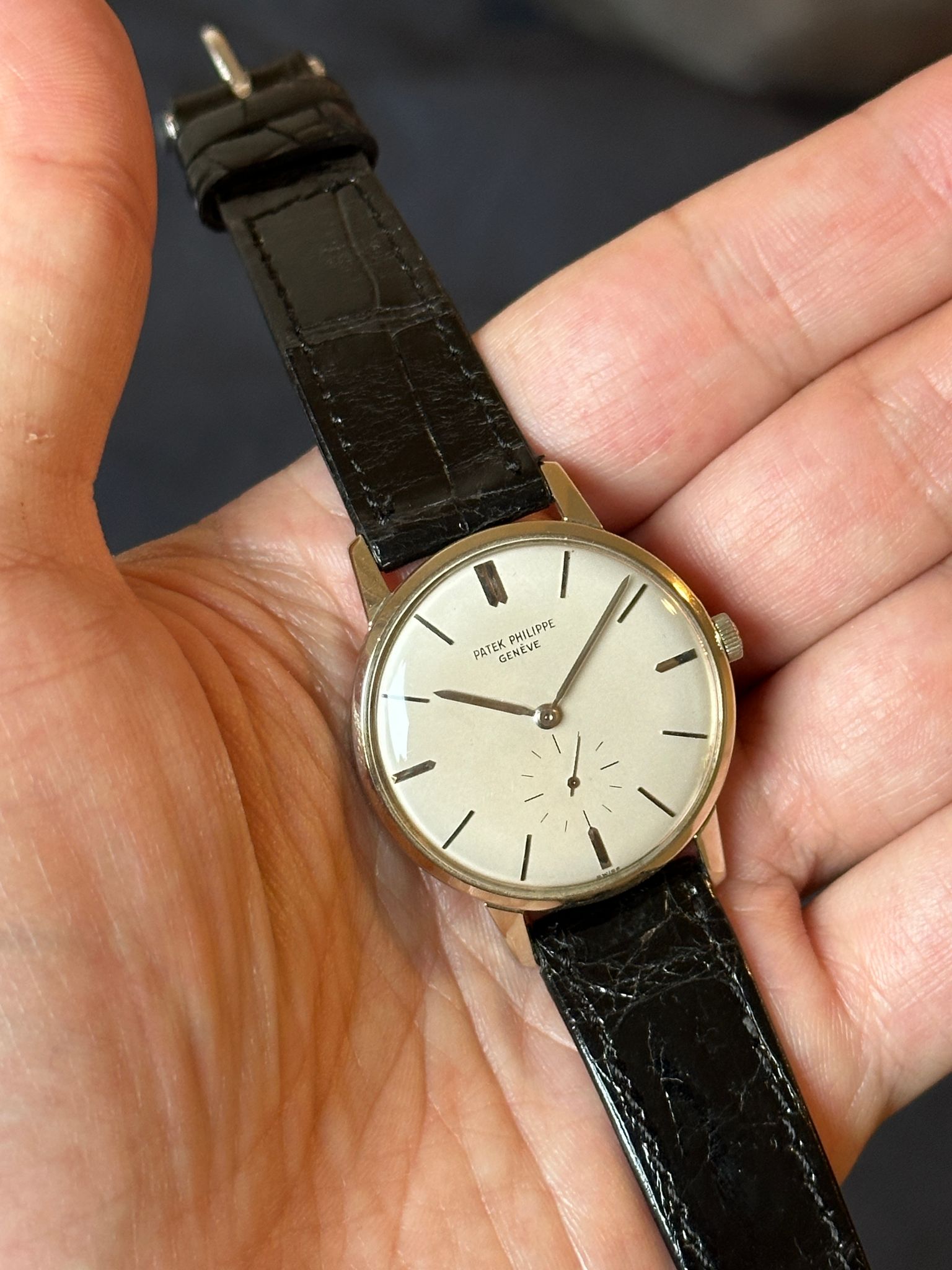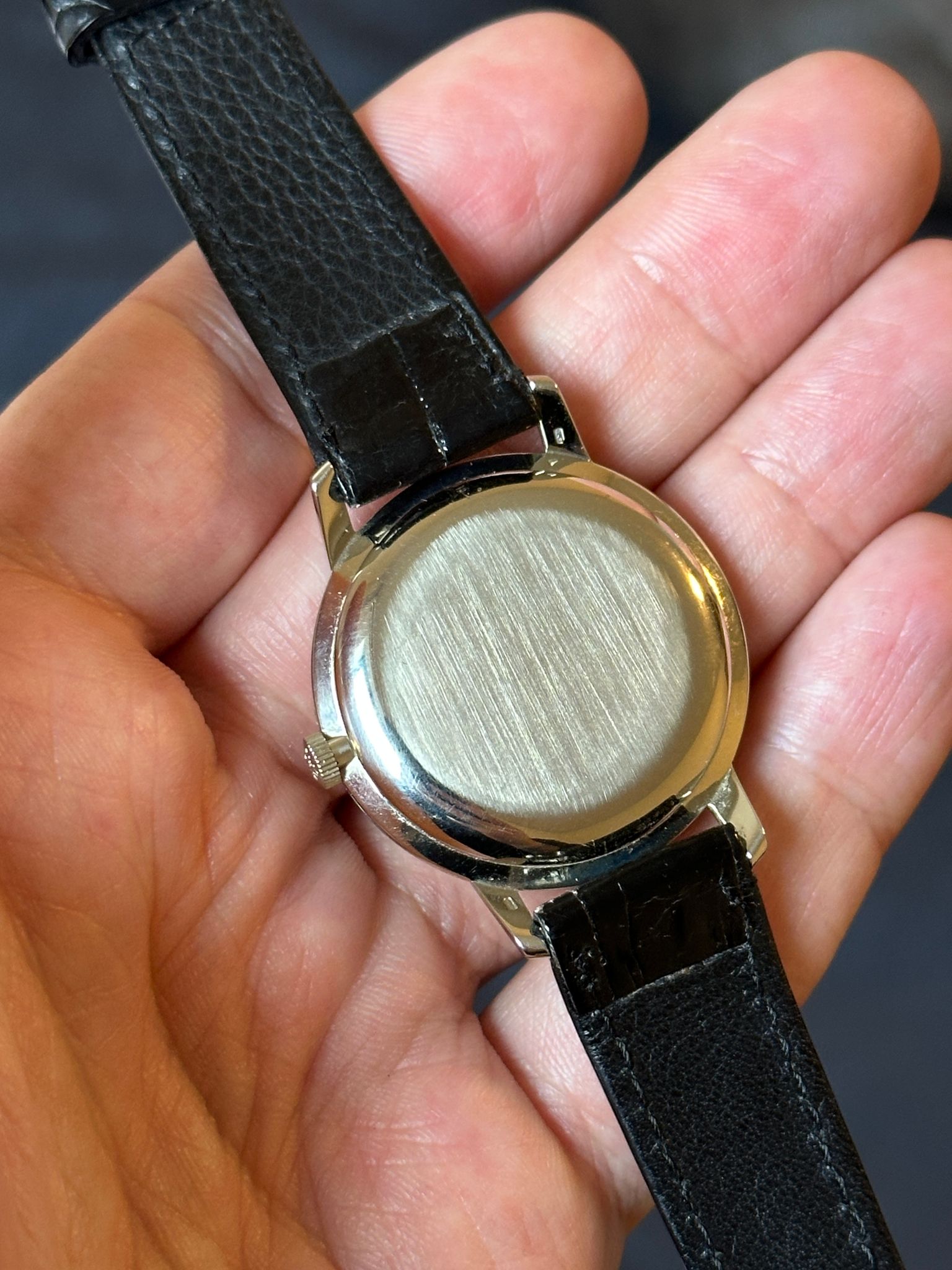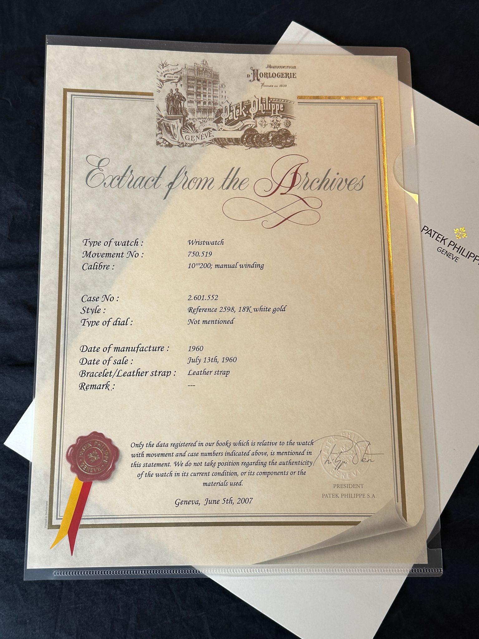 Lovely 1960 Patek Calatrava reference 2598 in white gold with extract and correct buckle. Small scratch on crystal.