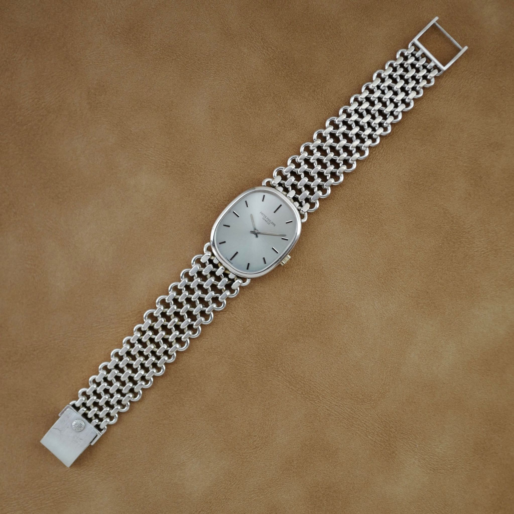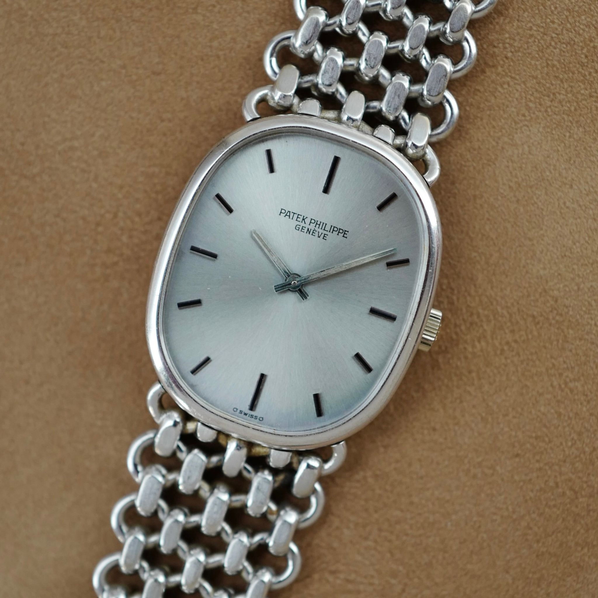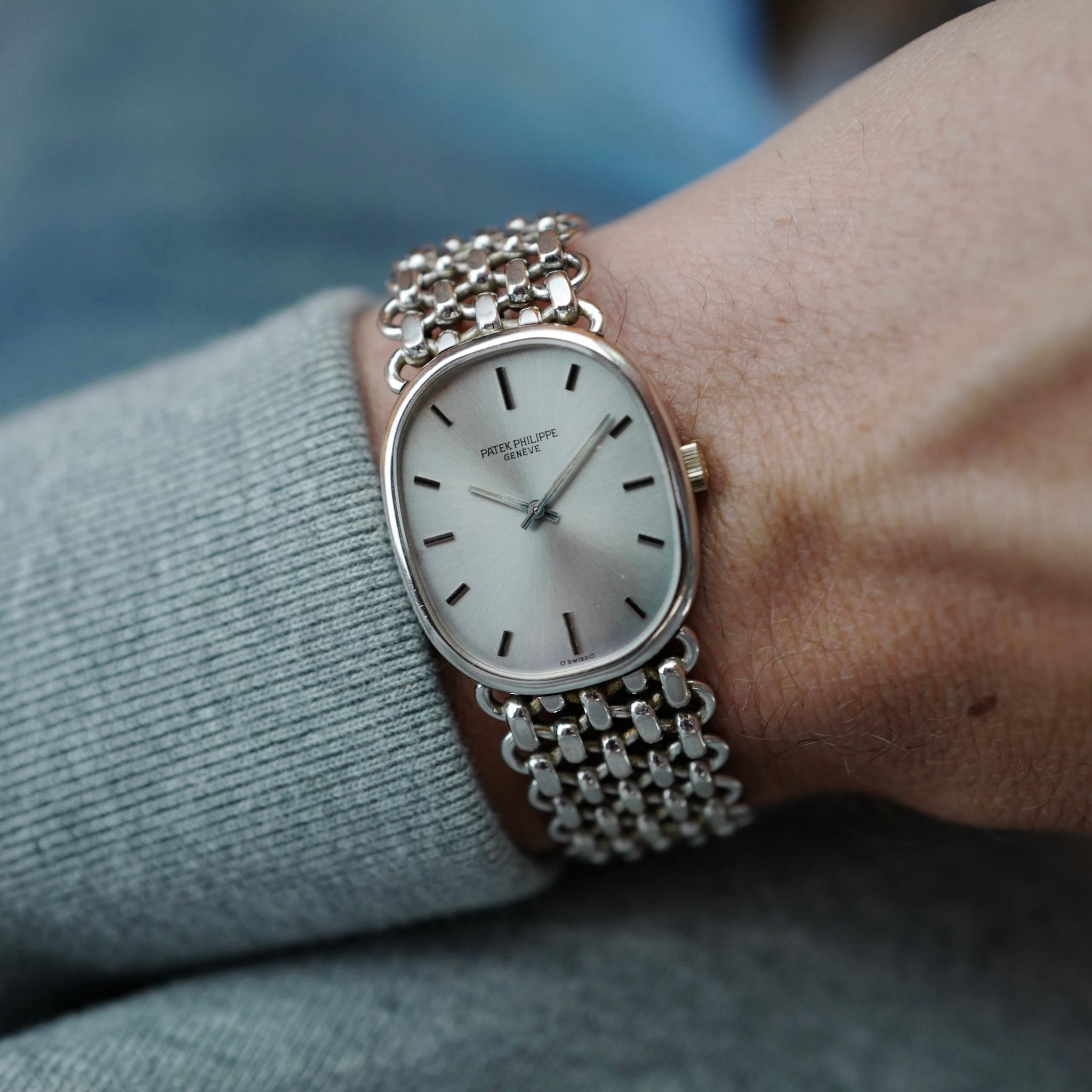 This Patek Philippe Ellipse Ref. 3648 features a beautiful silver dial and iconic chain link bracelet made by Jean Pierre Ecoffey.