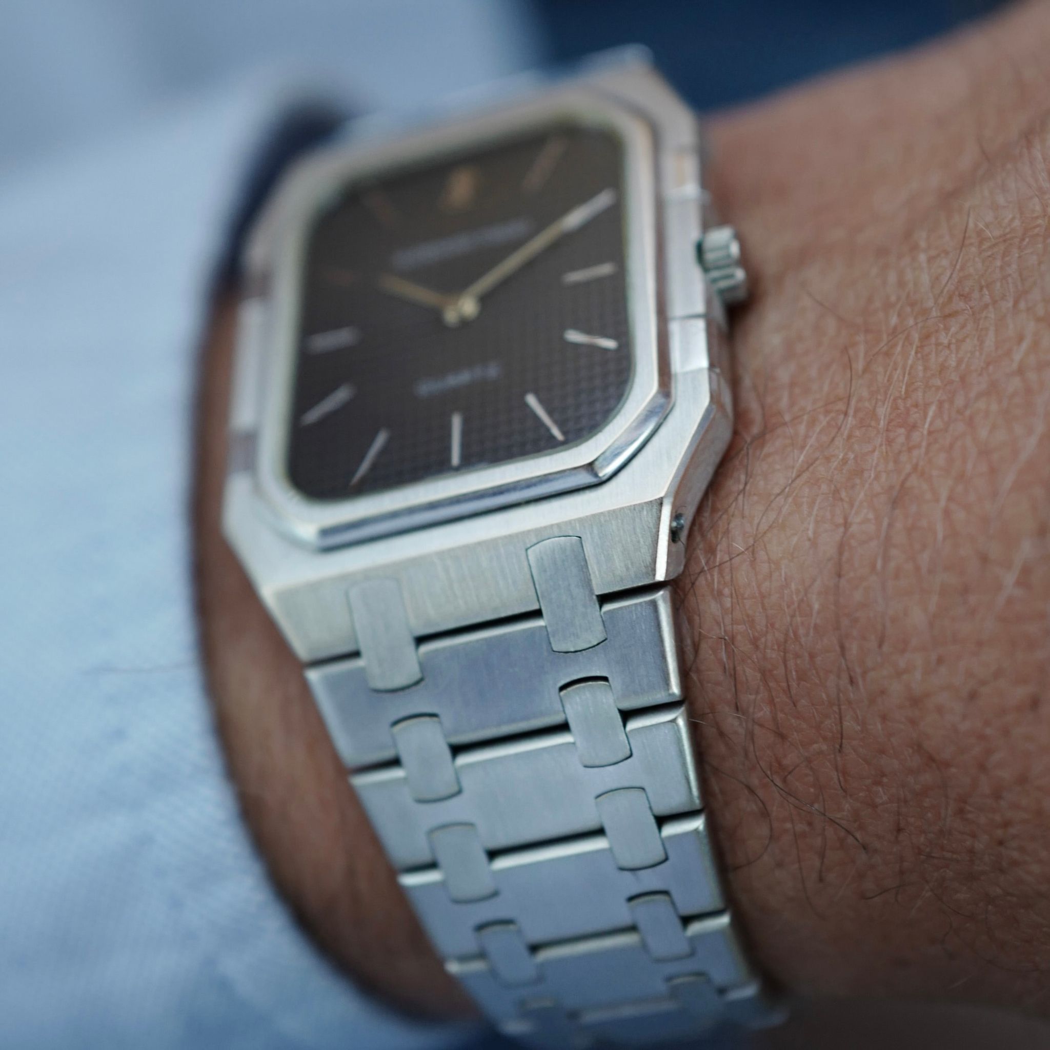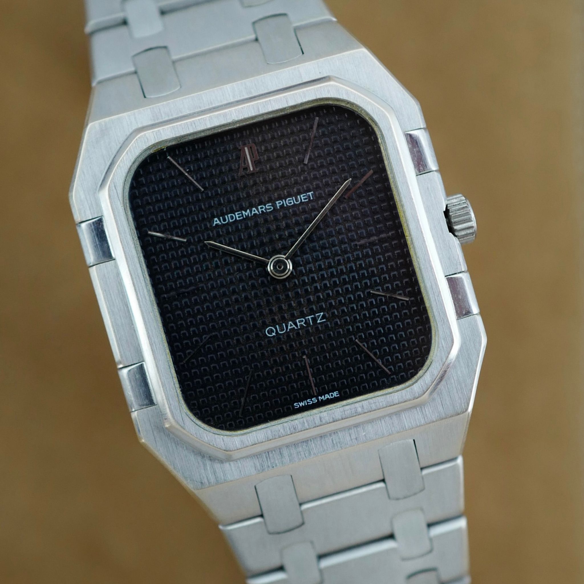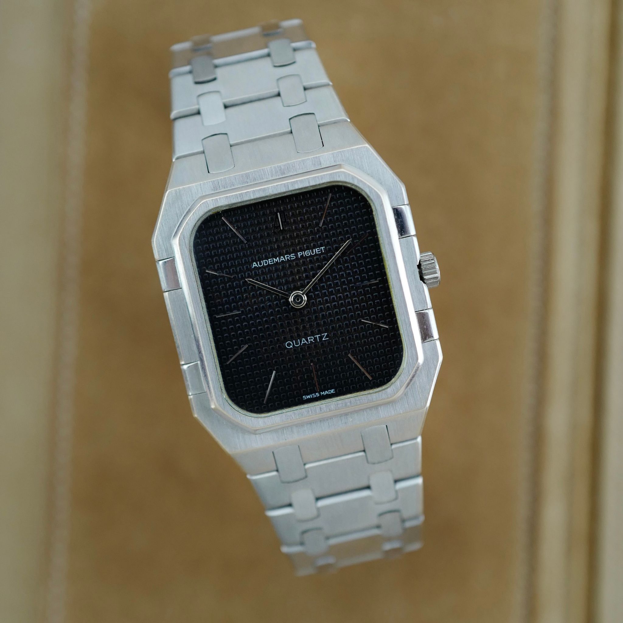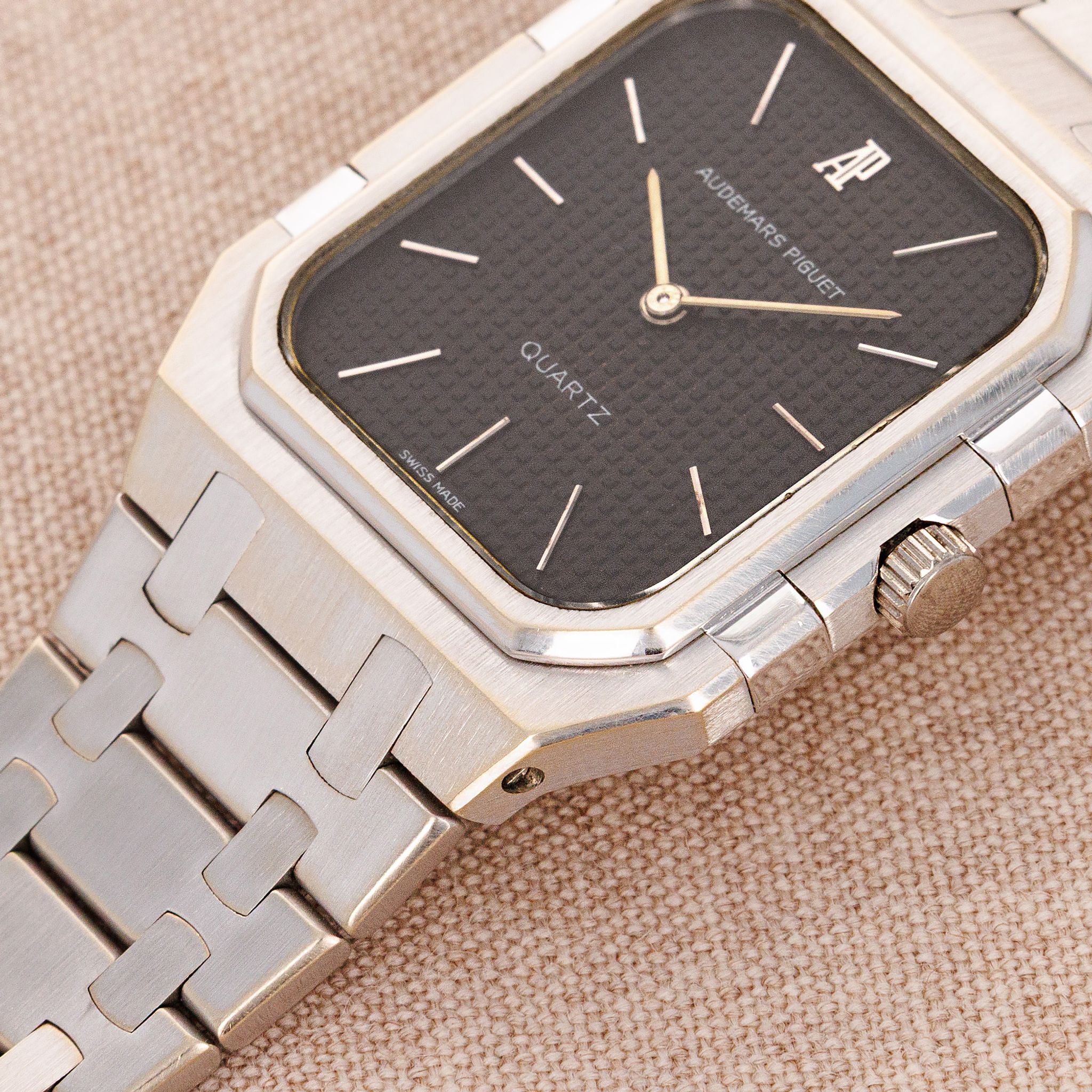 Introduced in the late 1970s, the Audemars Piguet Reference 6005 is a close relative of the Royal Oak but with a few notable differences. This reference was designed by Jacqueline Dimier who explained the birth of the watch - The temptation to introduce quartz in the Royal Oak line was great, but the management was opposed to it and instead created a related line, ref. 6005, that was rectangular with bevelled edge. It had the same bracelet and suitable finishing, but to set itself apart, the screws were replaced by four studs.