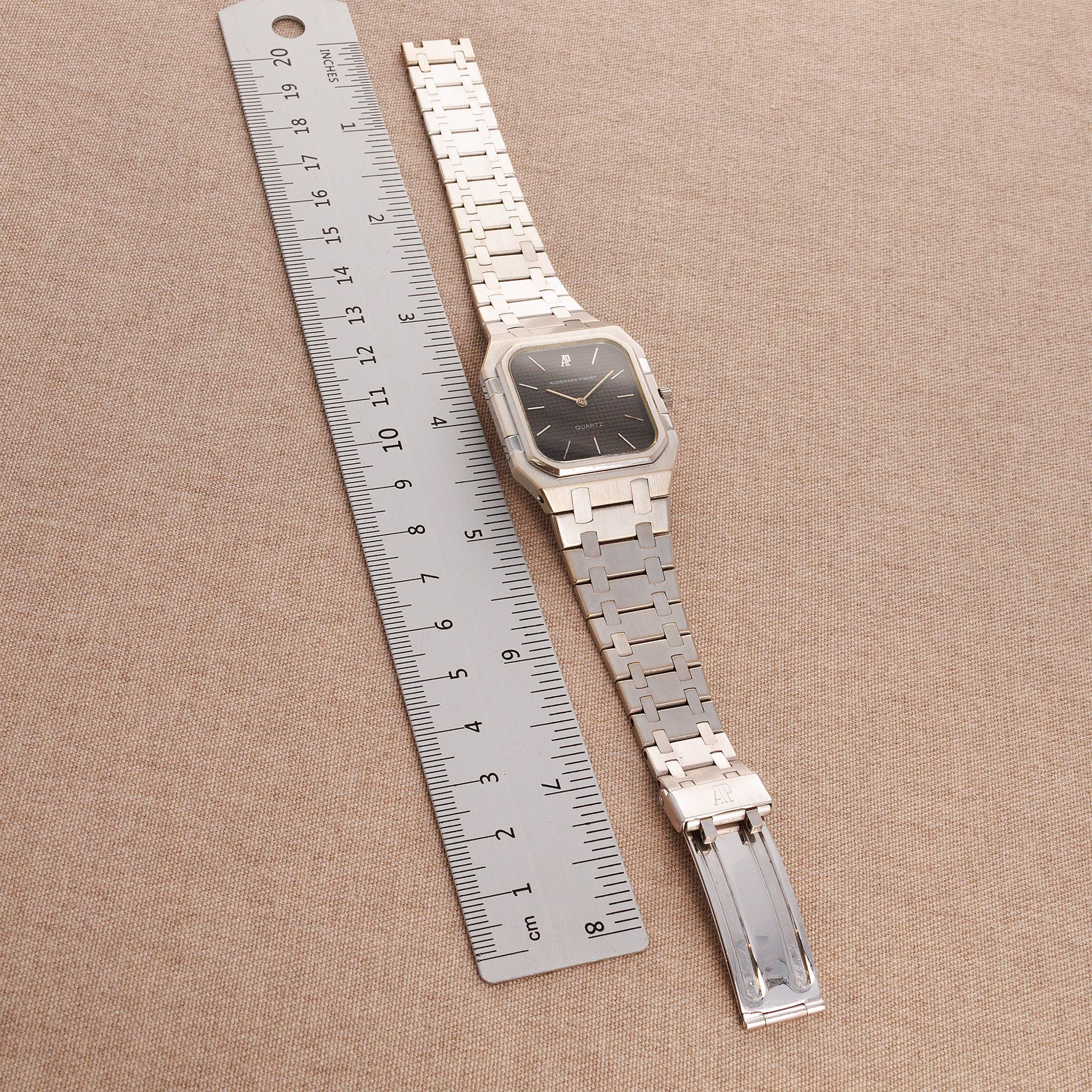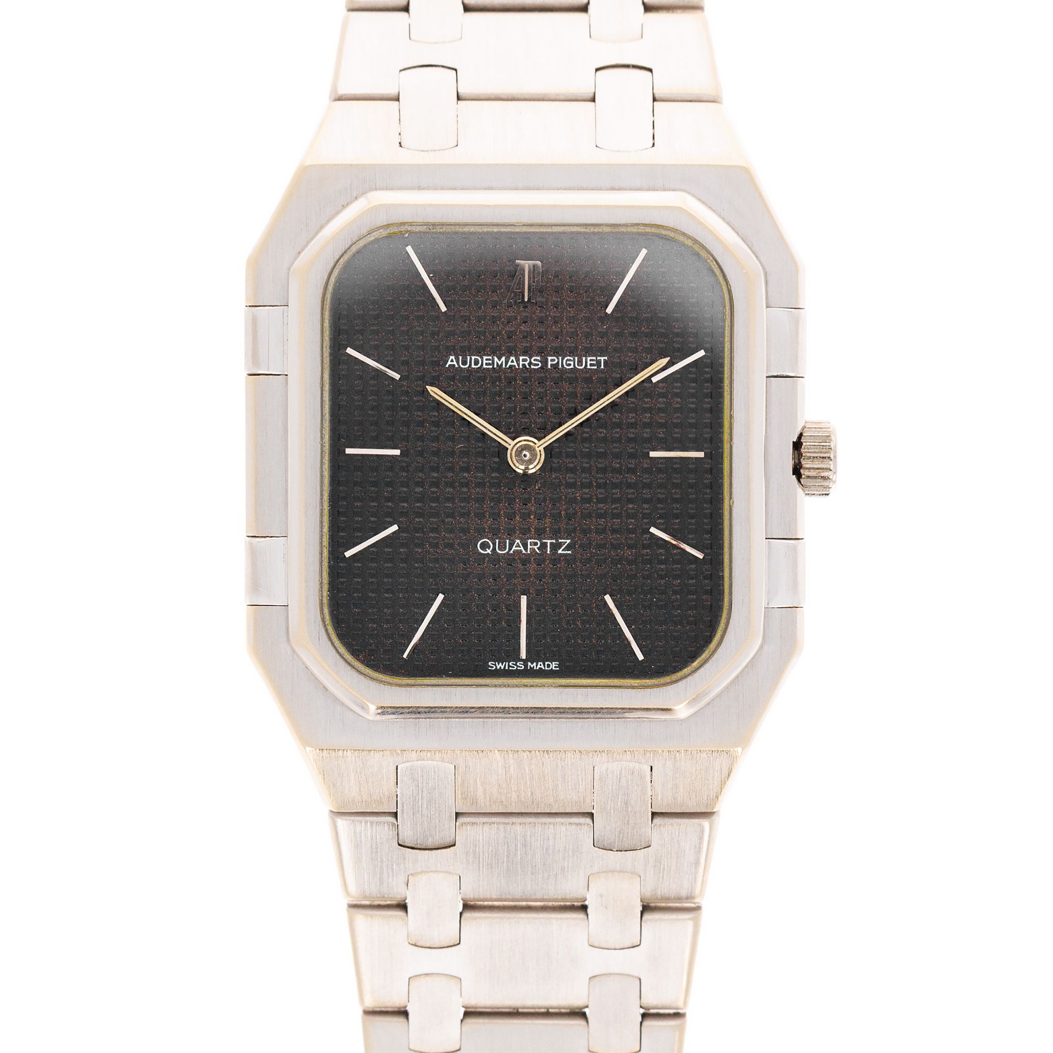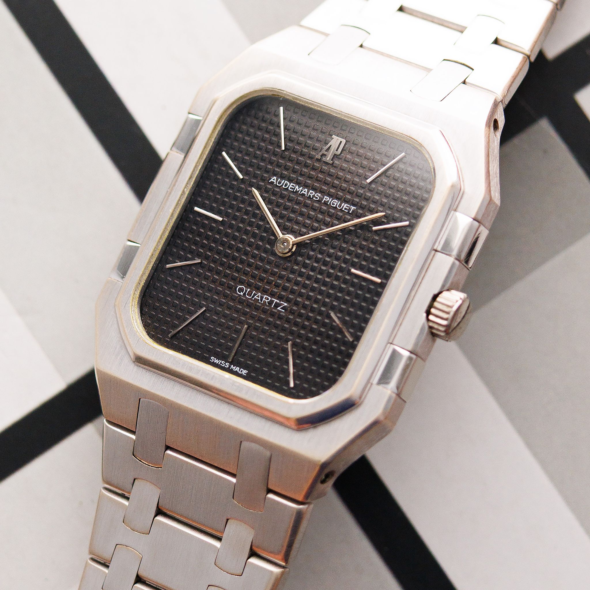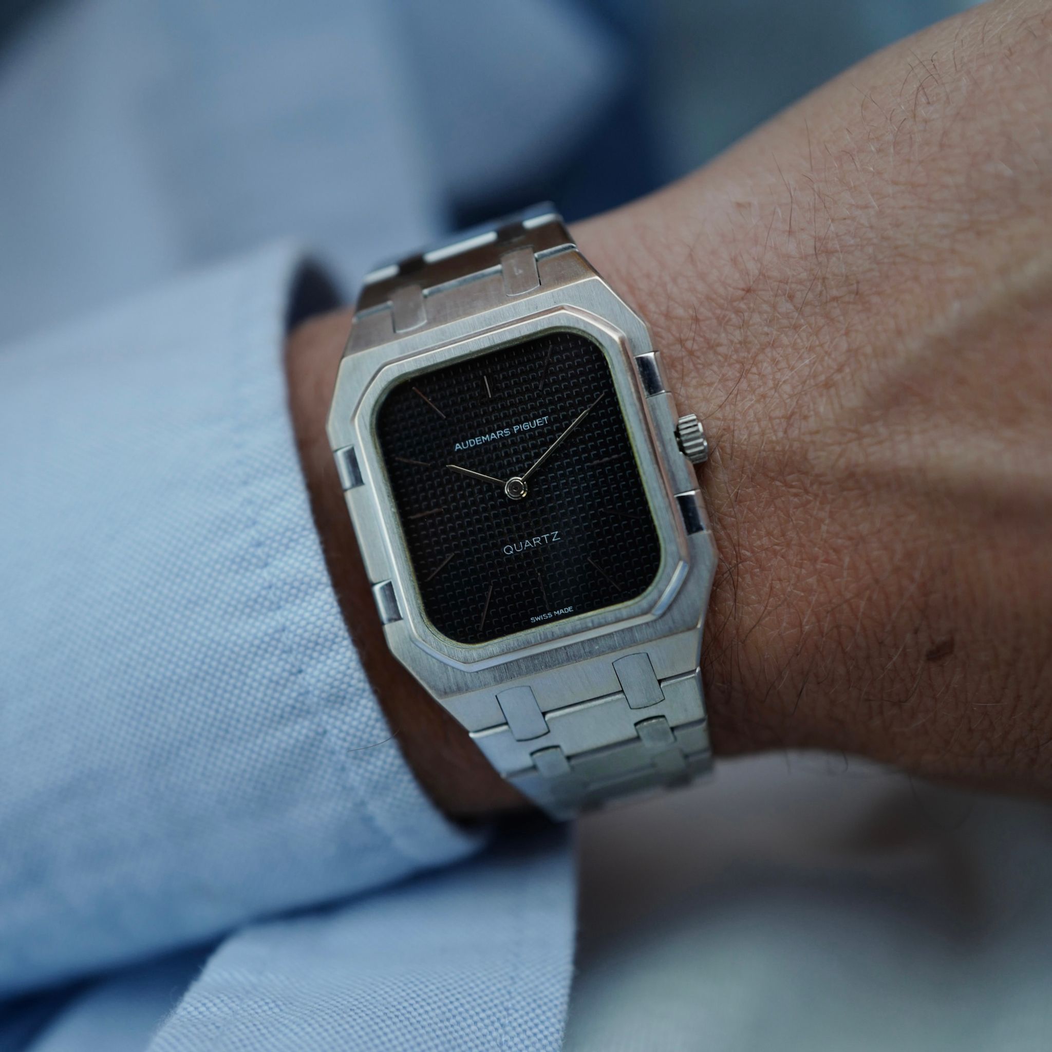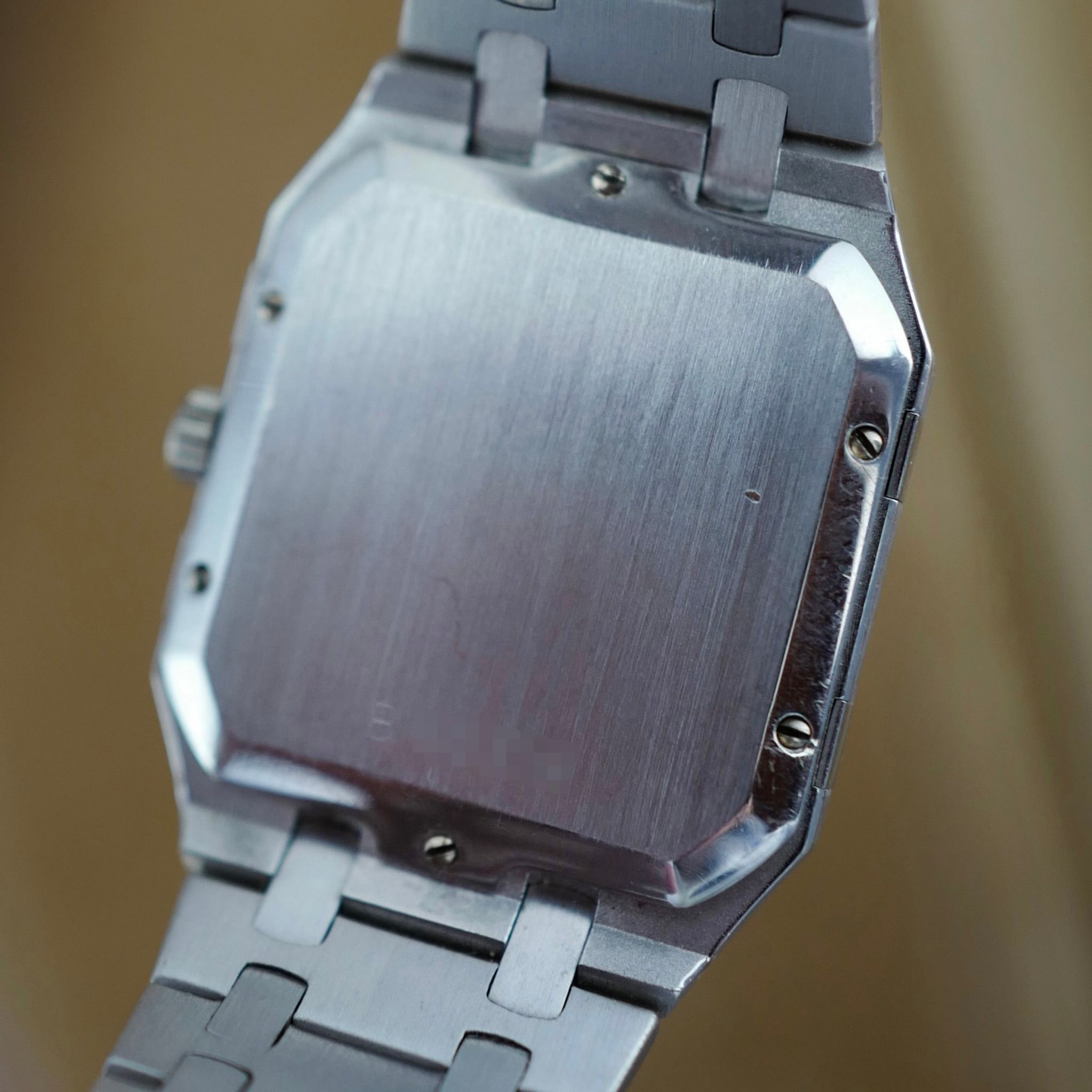 Introduced in the late 1970s, the Audemars Piguet Reference 6005 is a close relative of the Royal Oak but with a few notable differences. This reference was designed by Jacqueline Dimier who explained the birth of the watch - The temptation to introduce quartz in the Royal Oak line was great, but the management was opposed to it and instead created a related line, ref. 6005, that was rectangular with bevelled edge. It had the same bracelet and suitable finishing, but to set itself apart, the screws were replaced by four studs.