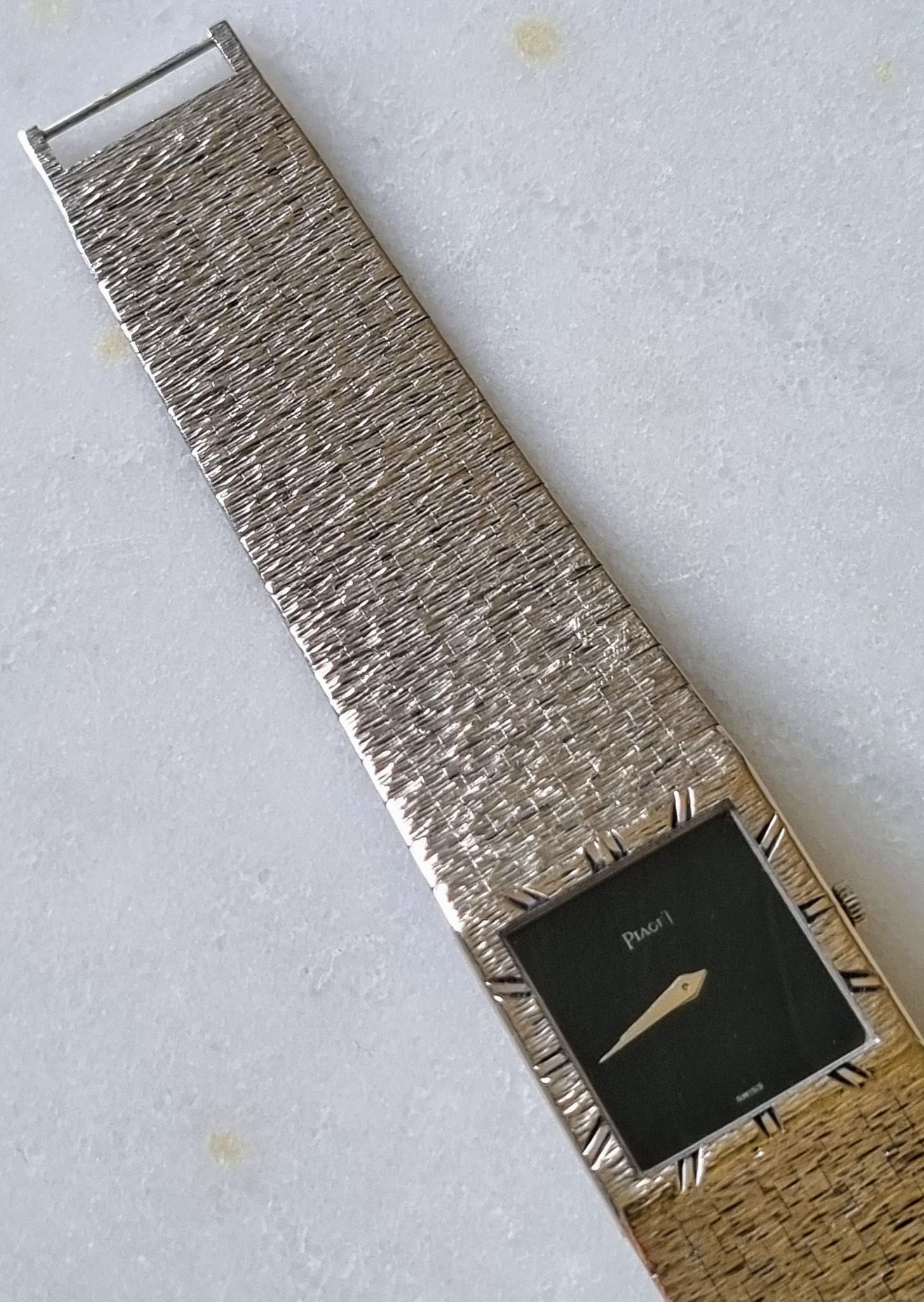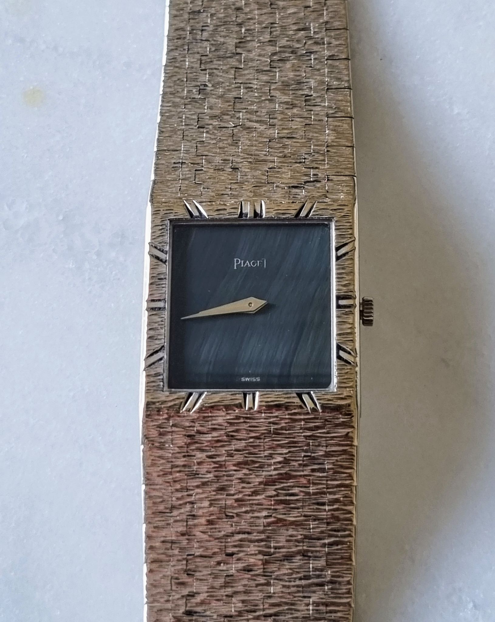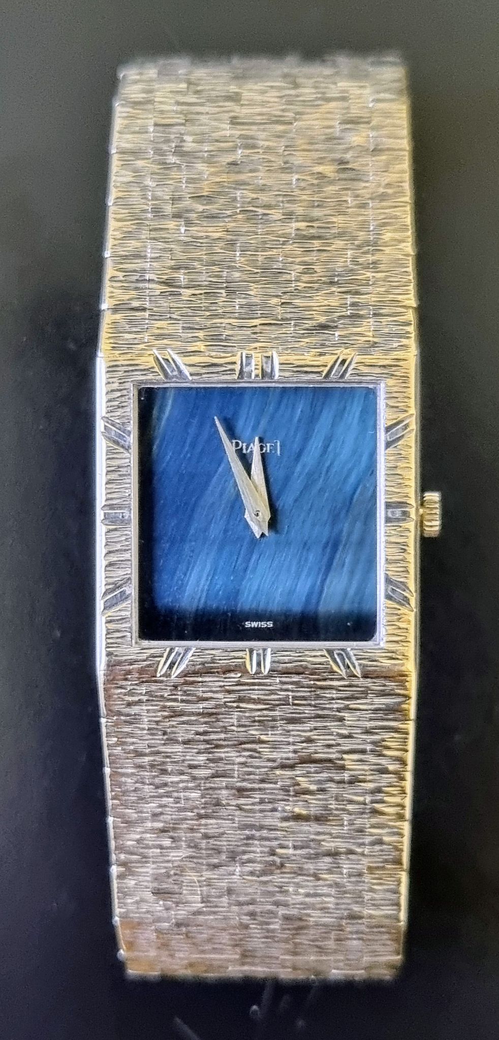 Exquisite ultra thin all white gold piaget with super rare hawk or falcon eye stone dial.
