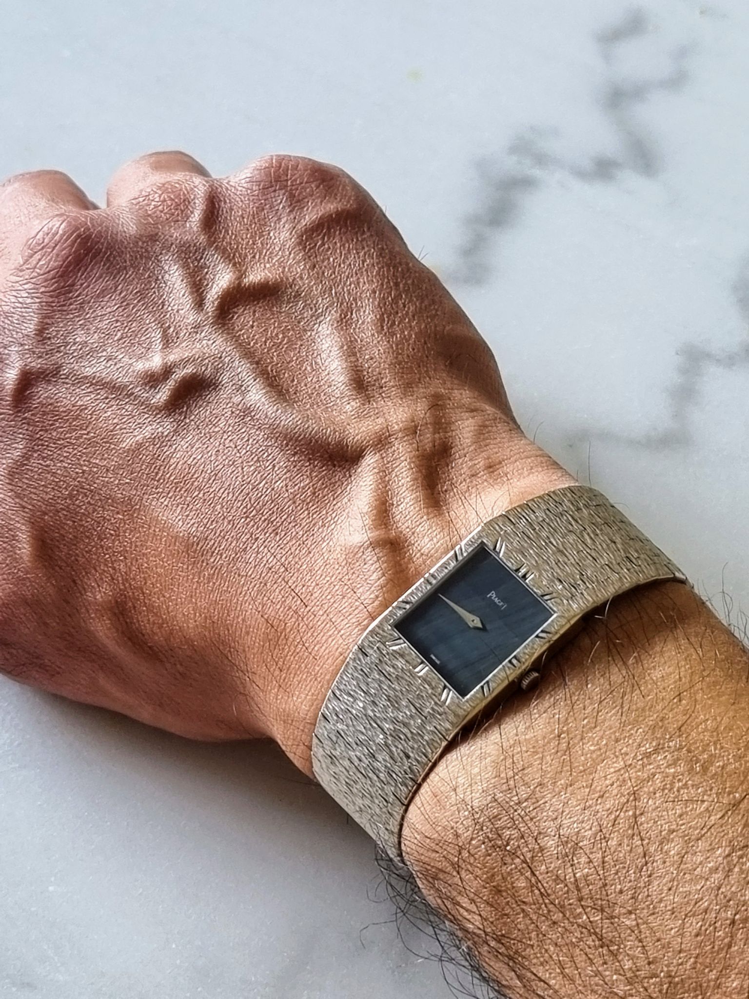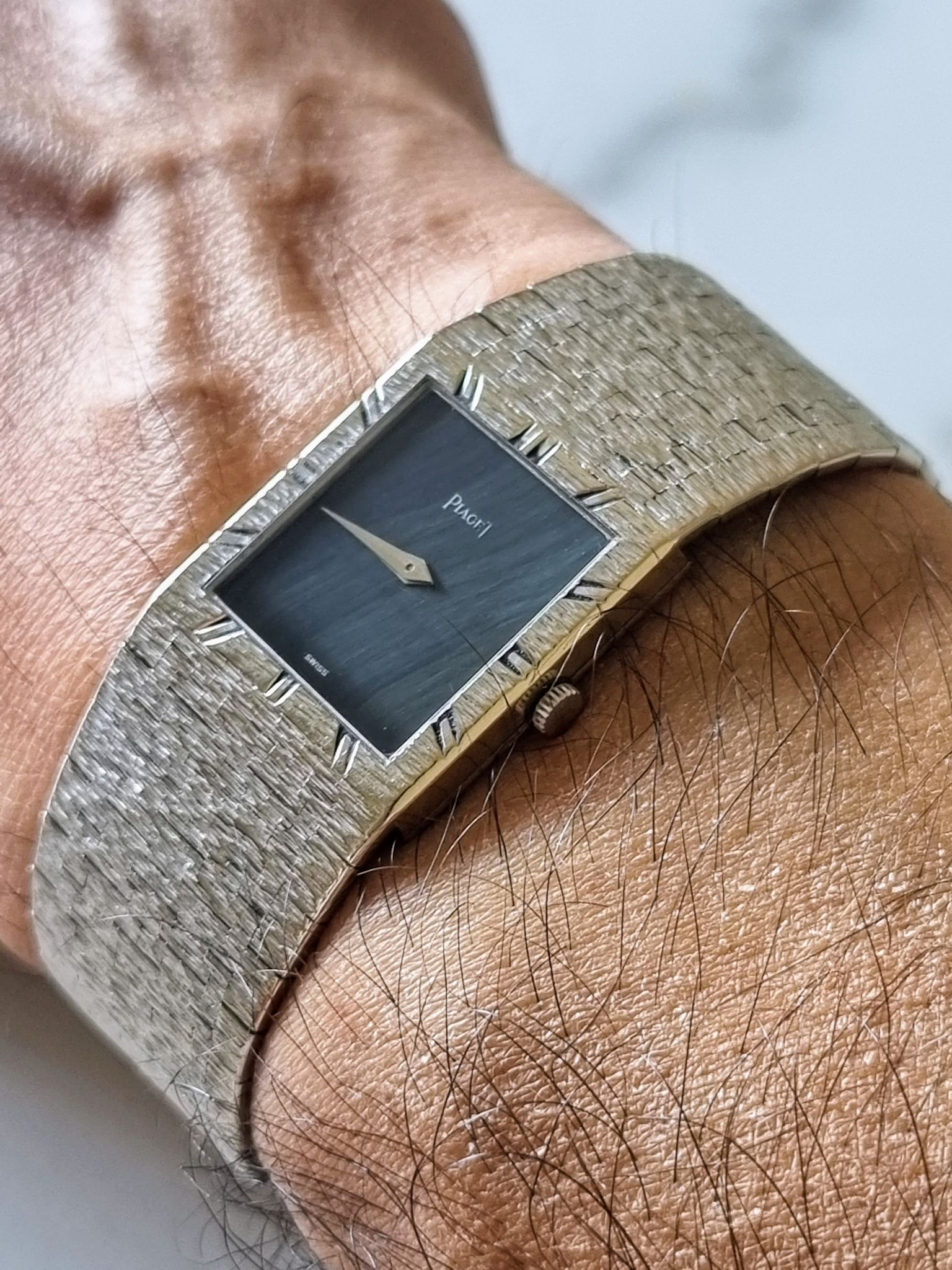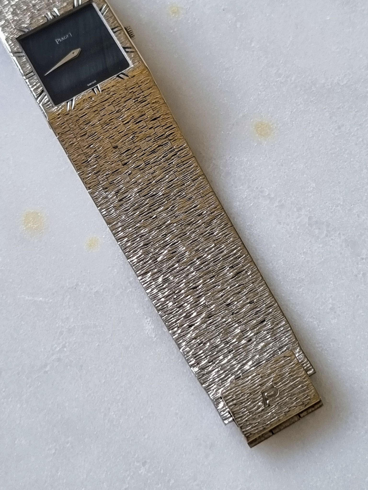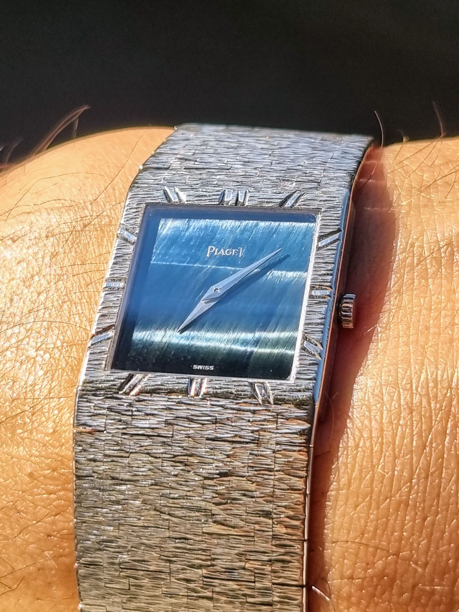 Exquisite ultra thin all white gold piaget with super rare hawk or falcon eye stone dial.
