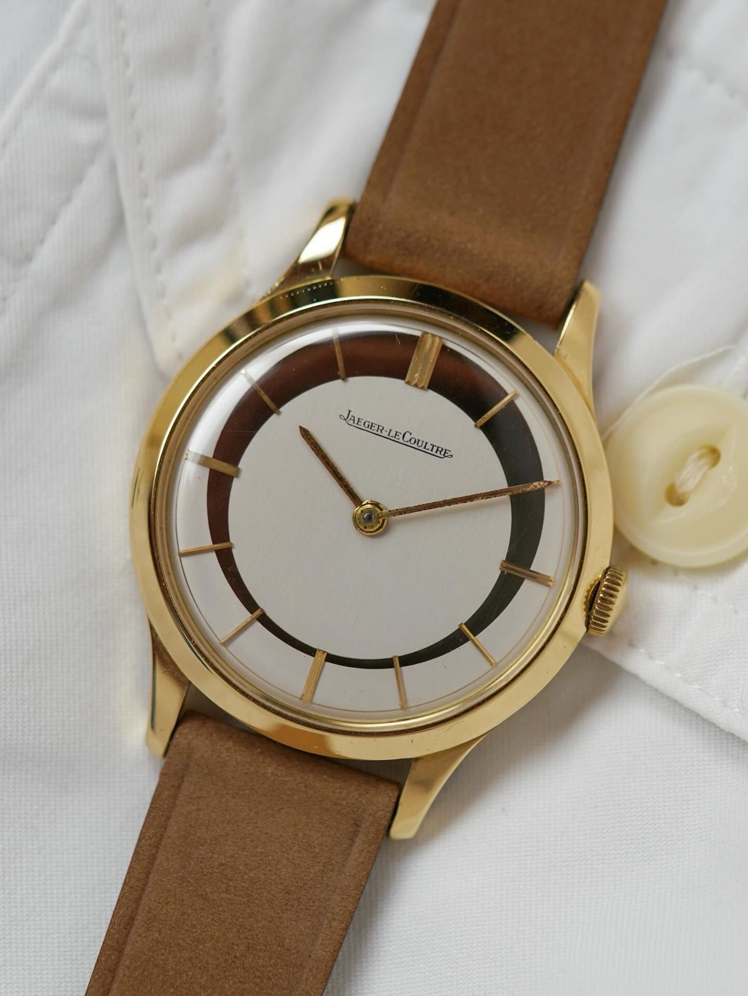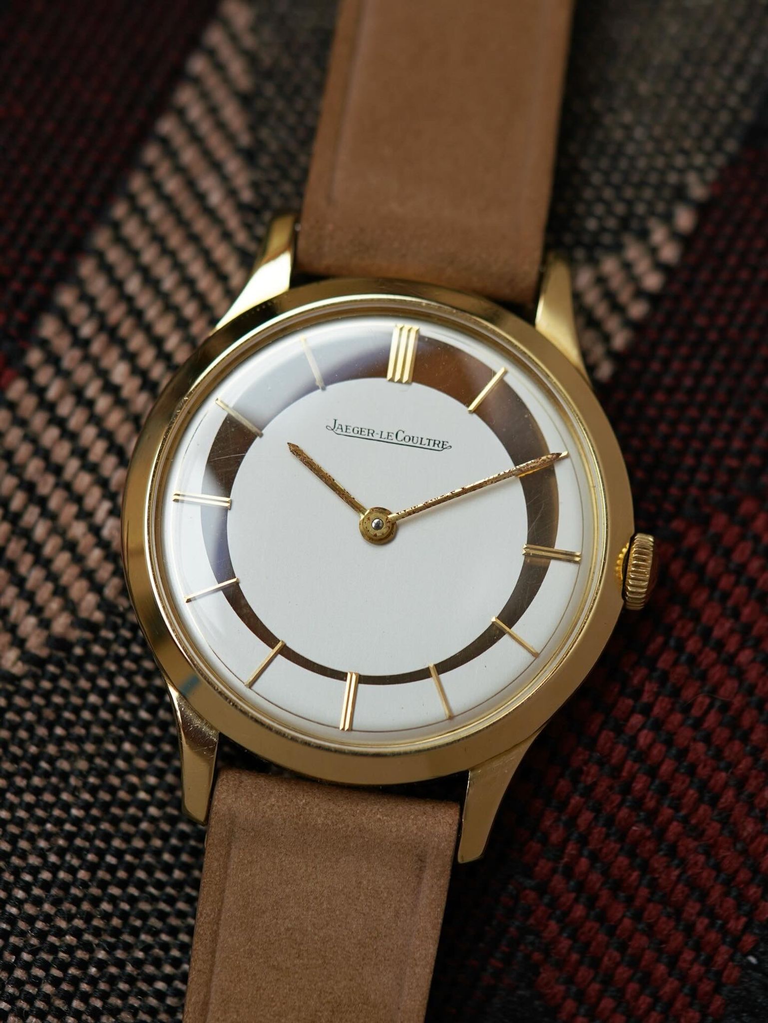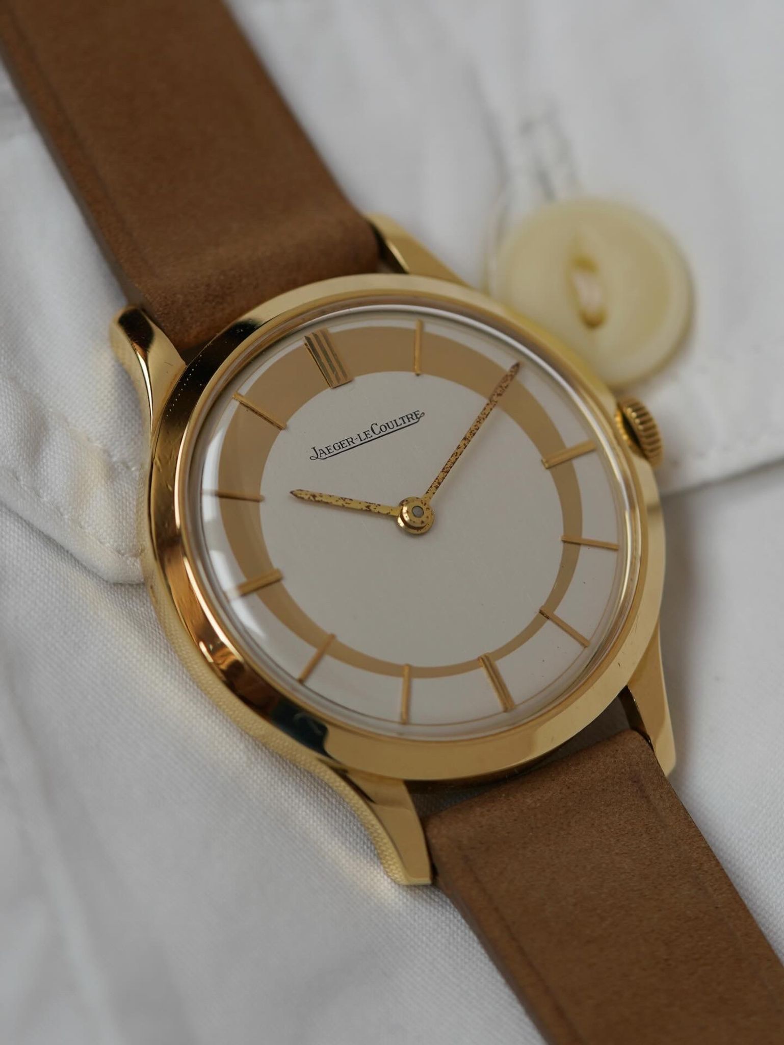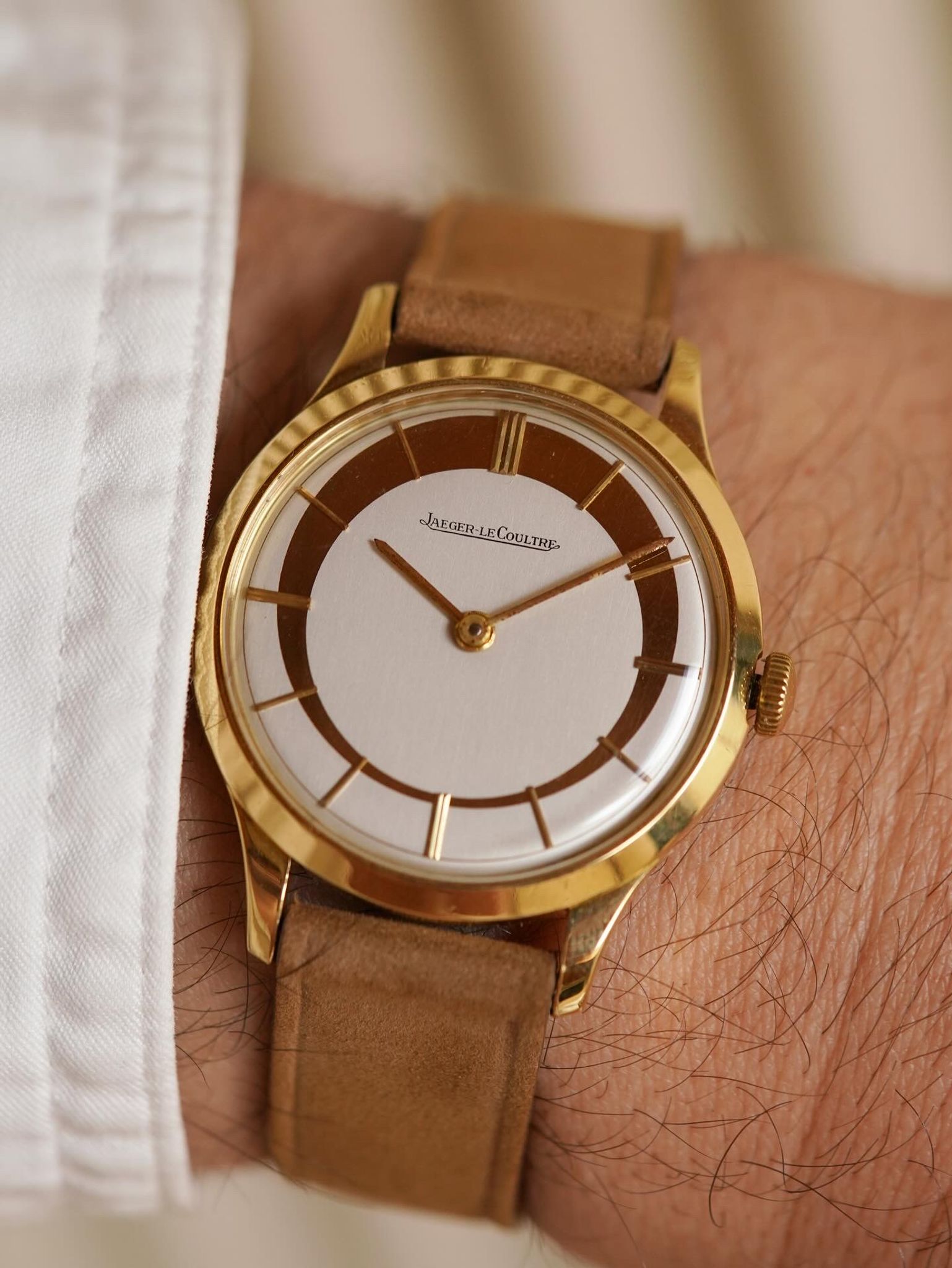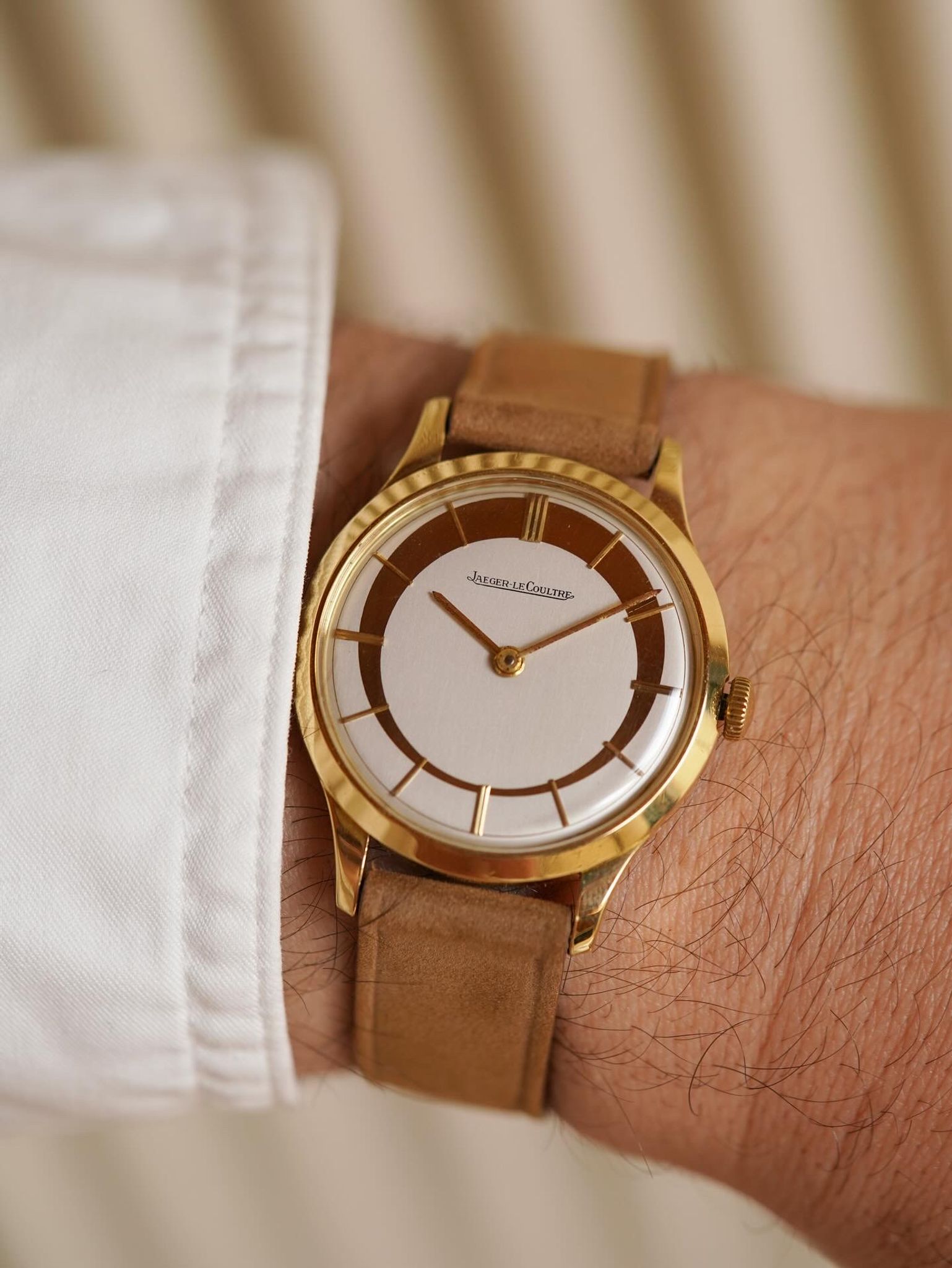 A most exciting find ! A previously unseen and phenomenal piece of design horology by Jaeger LeCoultre featuring an assymetric style, crescent moon 🌙 dial housed in a stunning 18k solid yellow gold case and in-house bumper movement.