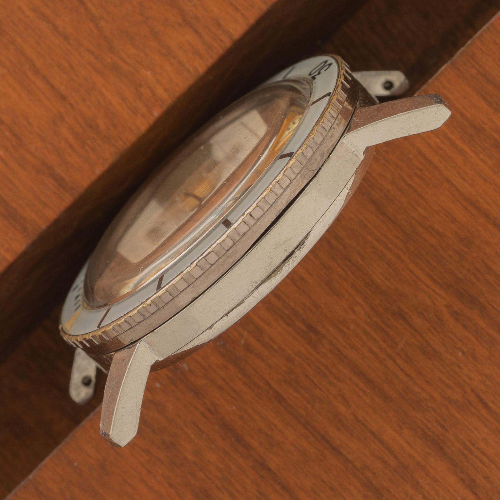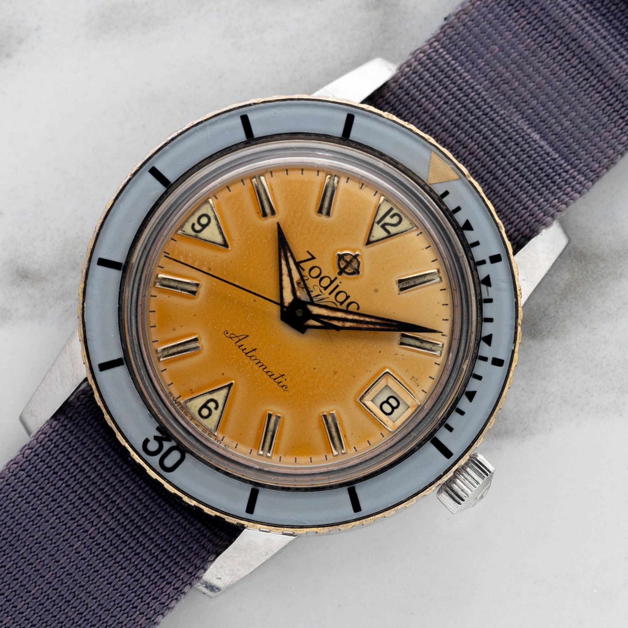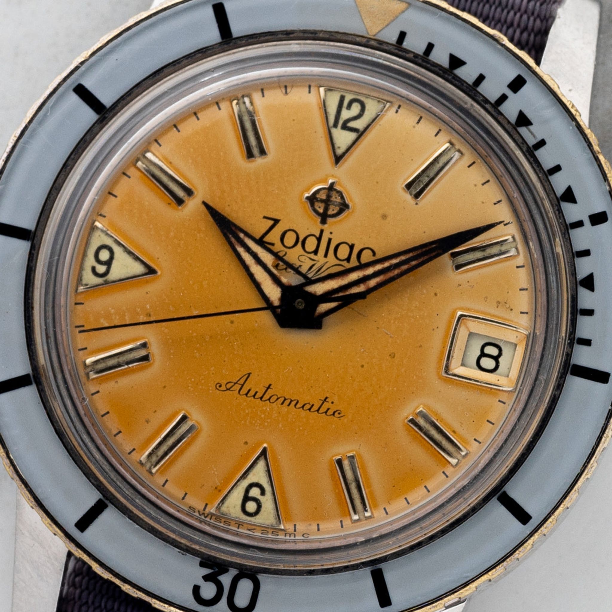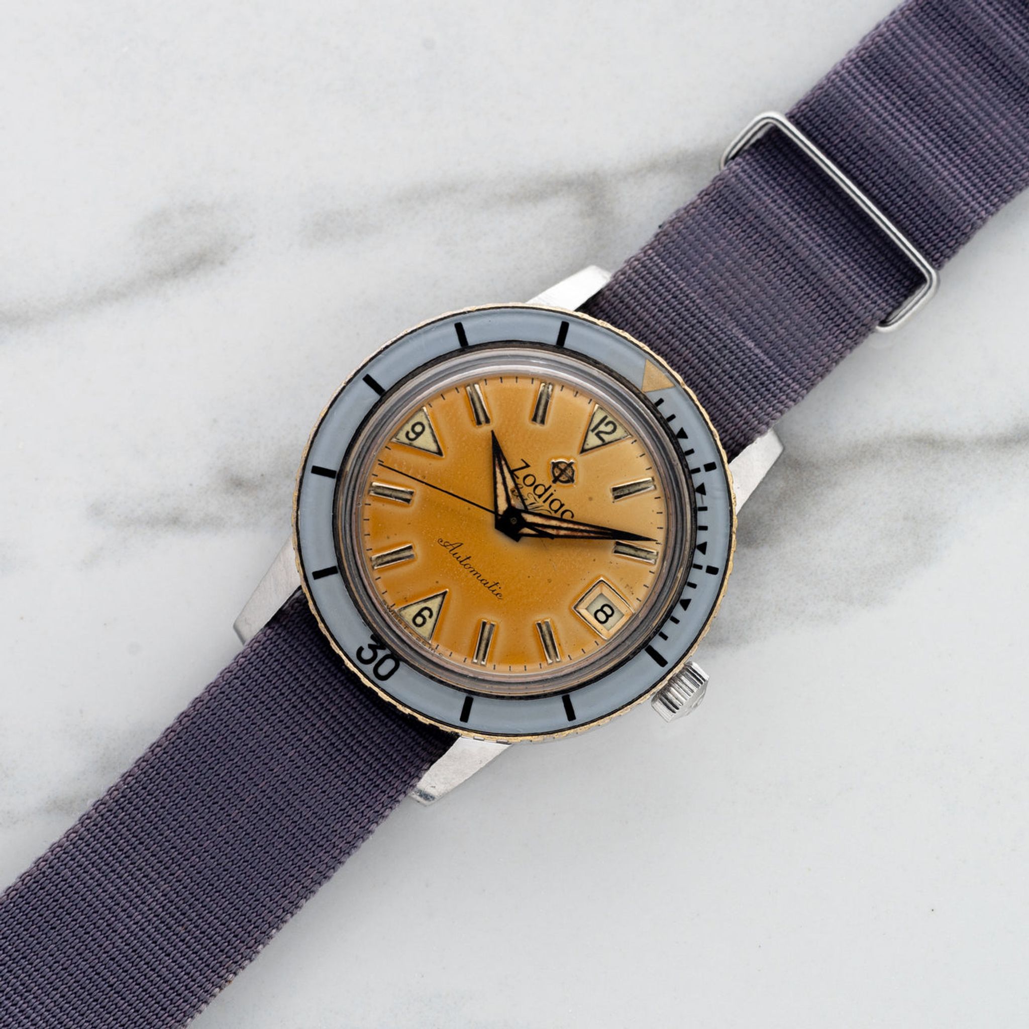 This particular reference 722-946B features an absolutely incredible tropical dial that has changed from white to a wonderful blend of yellow and orange. The bakelite insert remains in fantastic condition, showing now cracks which is also difficult to find in these. The watch is paired with a custom aged phoenix NATO-style strap to match the washed out appearance of the dial/bezel. If you've been hunting for a striking and truly unique looking Zodiac, this piece remains in fantastic shape and has just been completely overhauled by a top vintage Zodiac expert Yuriy Vakulenko (author of Collecting Vintage Zodiac Watches) and watchmaker so its ready to enjoy for years to come.
